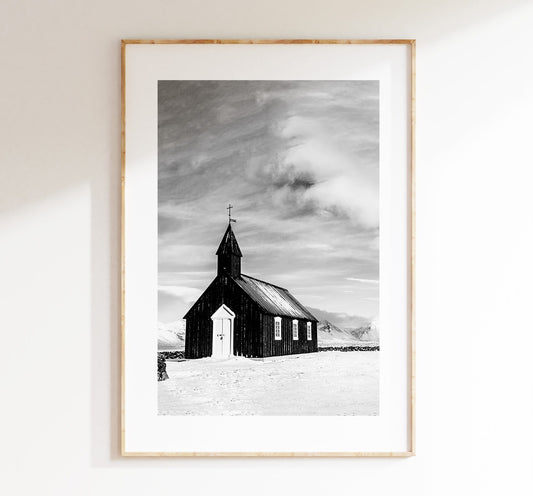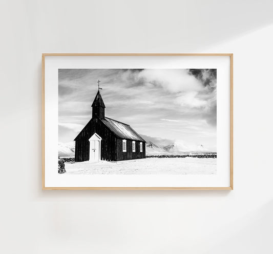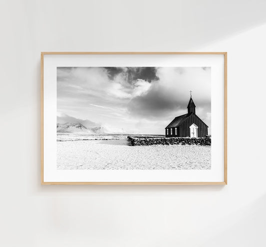 Budir Church - Iceland Photography Print - Iceland Wall Art - Iceland Poster - Black and White Photography - Landscape - Architecture - Art