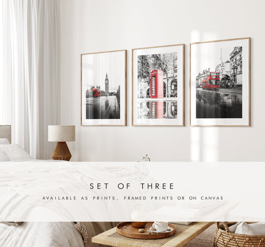 London Print Set of Three - Black and White - Pop of Red - London Print Set - London Photography - Fine Art Photography - London Poster Set