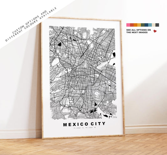 Mexico city and town maps in a minimalist black/white style or choose from a range of colours. These maps look great as a feature piece or as part of a set over a statement piece of furniture. You can personalise these print by adding up to two lines of custom text beneath the city title, or by adding a heart over a location or address.