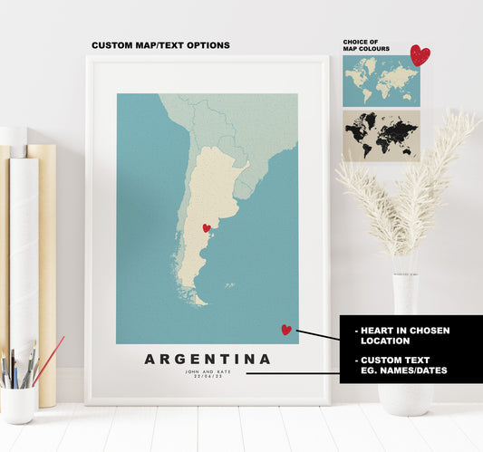 Argentina Map Print - Personalised Map Gift - Framed or Canvas Options Available - Custom Text Options - Personalised Gift - South America
