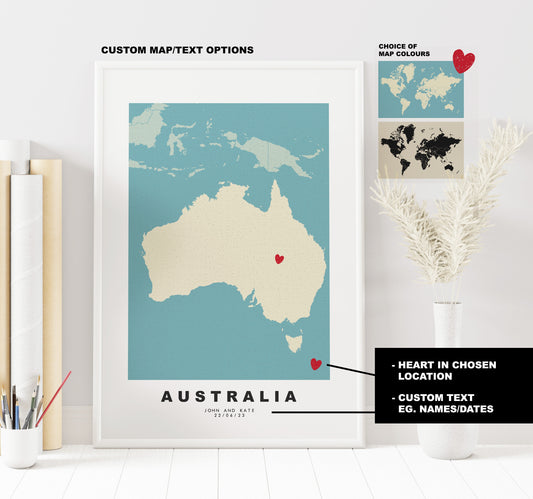 Australia Map Print - Personalised Map Gift - Framed or Canvas Options Available - Custom Text Options - Personalised Gift - Oceania