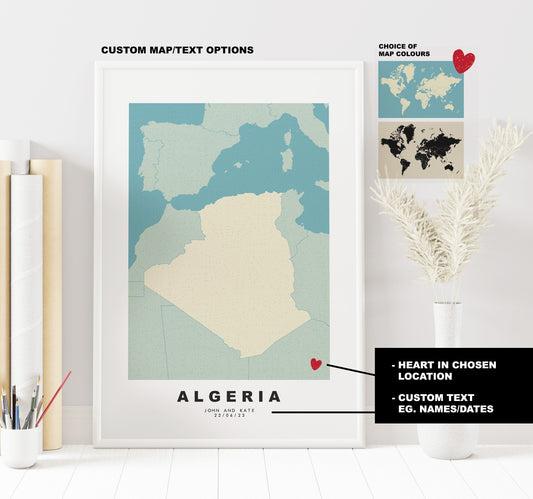 Algeria Map Print - Personalised Map Gift - Framed or Canvas Options Available - Custom Text Options - Personalised Gift - Africa