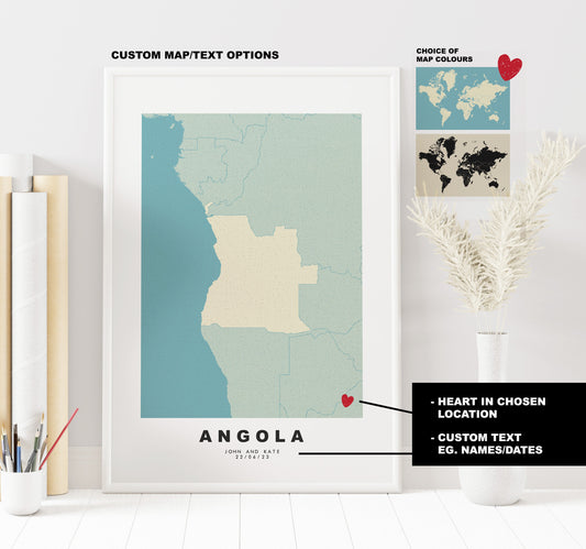 Angola Map Print - Personalised Map Gift - Framed or Canvas Options Available - Custom Text Options - Personalised Gift - Africa