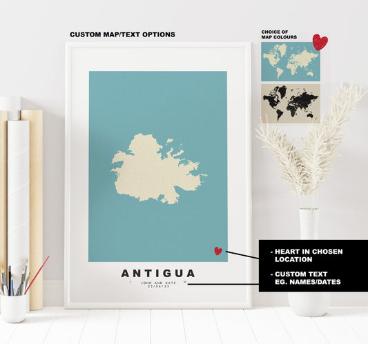 Antigua Map Print - Personalised Map Gift - Framed or Canvas Options Available - Custom Text Options - Personalised Gift - Caribbean