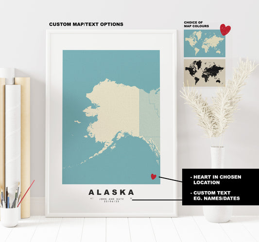 Alaska Map Print - Personalised Map Gift - Framed or Canvas Options Available - Custom Text Options - Personalised Gift - US States & Islands