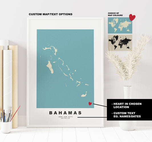 Bahamas Map Print - Personalised Map Gift - Framed or Canvas Options Available - Custom Text Options - Personalised Gift - Caribbean