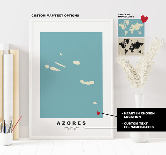 Azores Map Print - Personalised Map Gift - Framed or Canvas Options Available - Custom Text Options - Personalised Gift - Portugal & Islands