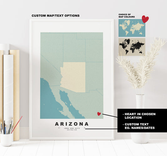 Arizona Map Print - Personalised Map Gift - Framed or Canvas Options Available - Custom Text Options - Personalised Gift - US States & Islands