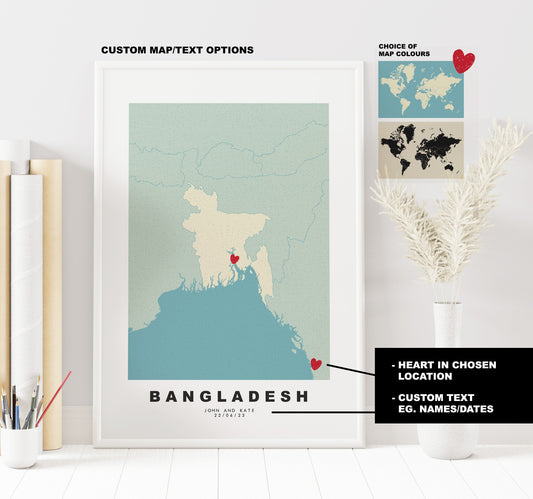 Bangladesh Map Print - Personalised Map Gift - Framed or Canvas Options Available - Custom Text Options - Personalised Gift - Asia