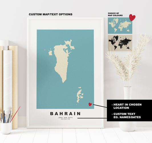 Bahrain Map Print - Personalised Map Gift - Framed or Canvas Options Available - Custom Text Options - Personalised Gift - Asia