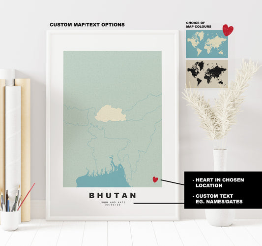 Bhutan Map Print - Personalised Map Gift - Framed or Canvas Options Available - Custom Text Options - Personalised Gift - Asia