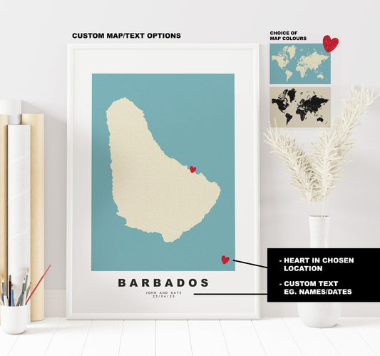Barbados Map Print - Personalised Map Gift - Framed or Canvas Options Available - Custom Text Options - Personalised Gift - Caribbean