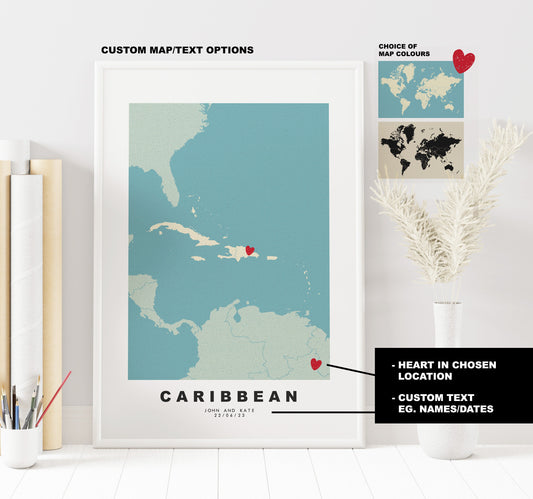 Caribbean Map Print - Personalised Map Gift - Framed or Canvas Options Available - Custom Text Options - Personalised Gift - Carribean