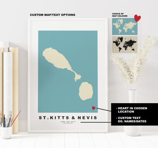 Saint Kitts and Nevis Map Print - Personalised Map Gift - Framed or Canvas Options Available - Custom Text Options - Personalised Gift - Caribbean