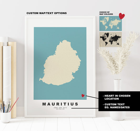 Mauritius Map Print - Personalised Map Gift - Framed or Canvas Options Available - Custom Text Options - Personalised Gift - Caribbean