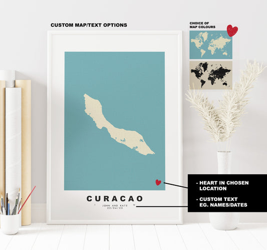 Curacao Map Print - Personalised Map Gift - Framed or Canvas Options Available - Custom Text Options - Personalised Gift - Caribbean