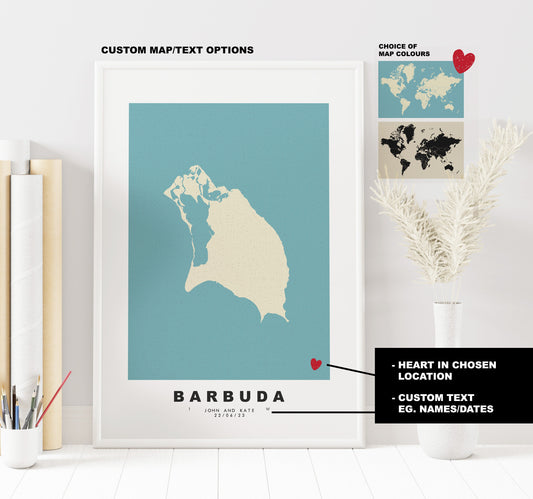 Barbuda Map Print - Personalised Map Gift - Framed or Canvas Options Available - Custom Text Options - Personalised Gift - Caribbean
