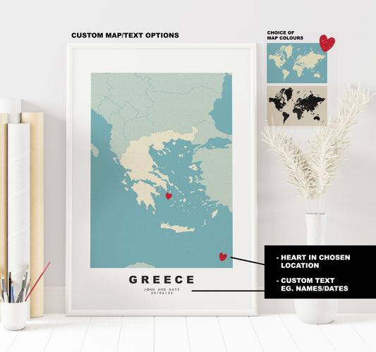 Greece Map Print - Personalised Map Gift - Framed or Canvas Options Available - Custom Text Options - Personalised Gift - Europe - Greece & Islands