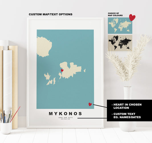 Mykonos Map Print - Personalised Map Gift - Framed or Canvas Options Available - Custom Text Options - Personalised Gift - Greece & Islands