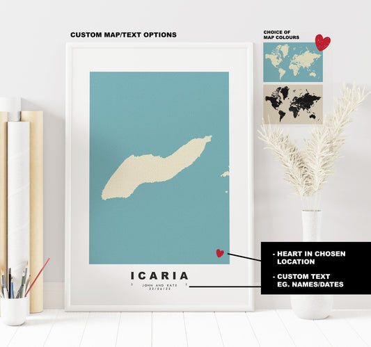 Icaria Map Print - Personalised Map Gift - Framed or Canvas Options Available - Custom Text Options - Personalised Gift - Greece & Islands