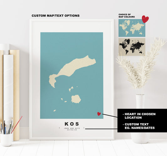 Kos Map Print - Personalised Map Gift - Framed or Canvas Options Available - Custom Text Options - Personalised Gift - Greece & Islands