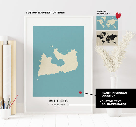Milos Map Print - Personalised Map Gift - Framed or Canvas Options Available - Custom Text Options - Personalised Gift - Greece & Islands