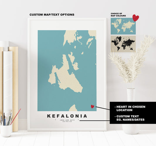 Kefalonia Map Print - Personalised Map Gift - Framed or Canvas Options Available - Custom Text Options - Personalised Gift - Greece & Islands