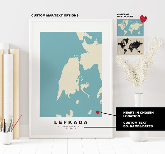 Lefkada Map Print - Personalised Map Gift - Framed or Canvas Options Available - Custom Text Options - Personalised Gift - Greece & Islands
