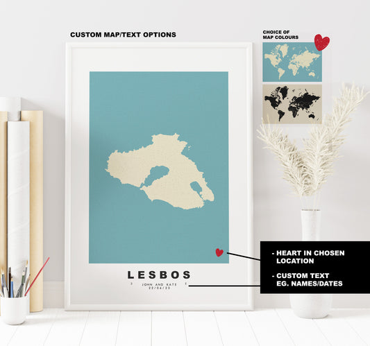 Lesbos Map Print - Personalised Map Gift - Framed or Canvas Options Available - Custom Text Options - Personalised Gift - Greece & Islands