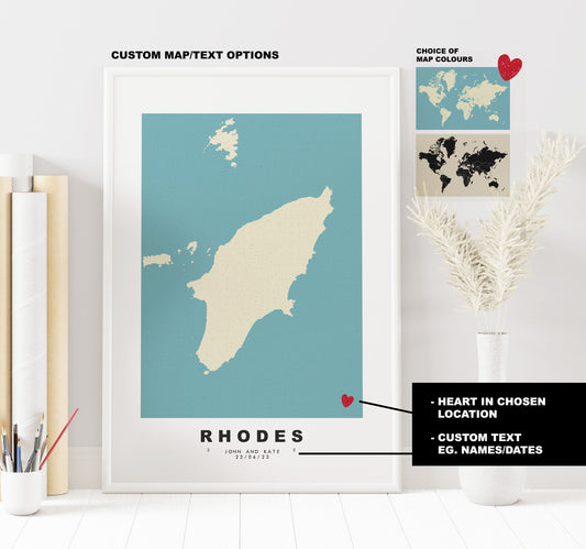 Rhodes Map Print - Personalised Map Gift - Framed or Canvas Options Available - Custom Text Options - Personalised Gift - Greece & Islands