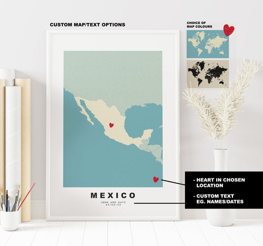 Mexico Map Print - Personalised Map Gift - Framed or Canvas Options Available - Custom Text Options - Personalised Gift - North America