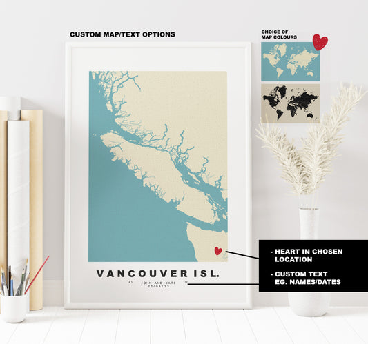 Vancouver Island Map Print - Personalised Map Gift - Framed or Canvas Options Available - Custom Text Options - Personalised Gift - North America