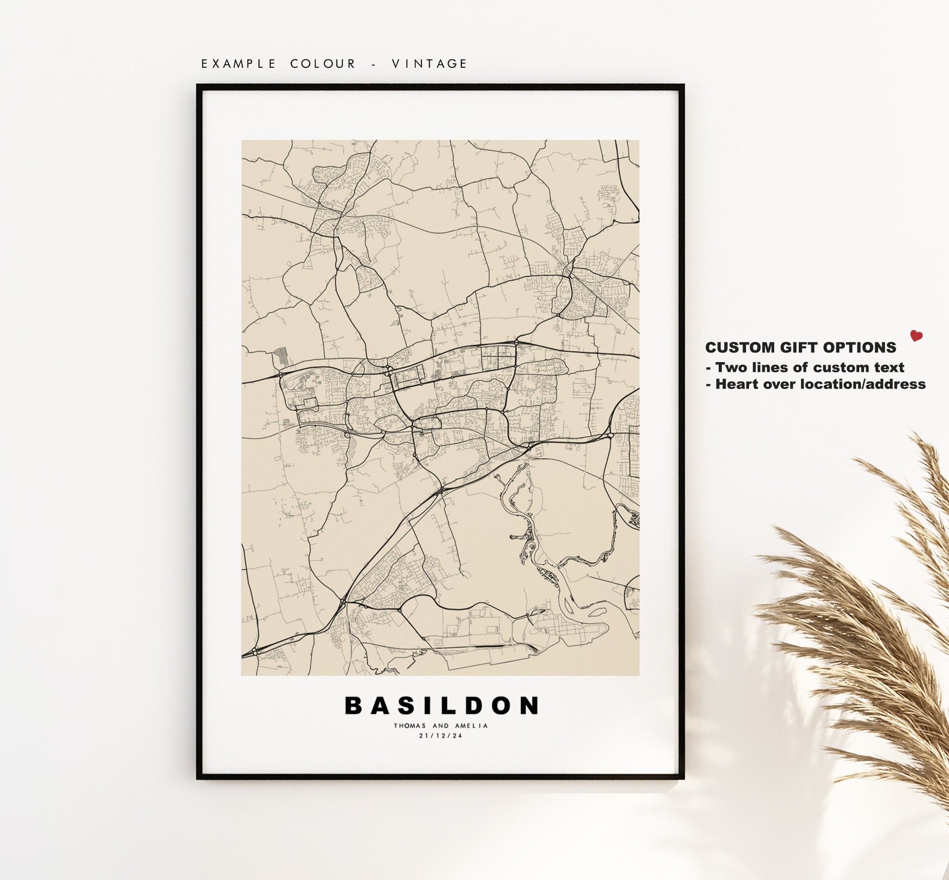 Basildon map in a minimalist black/white style or choose from a range of colours. These maps look great as a feature piece or as part of a set over a statement piece of furniture. You can personalise this print by adding up to two lines of custom text beneath the city title, or by adding a heart over a location or address.
