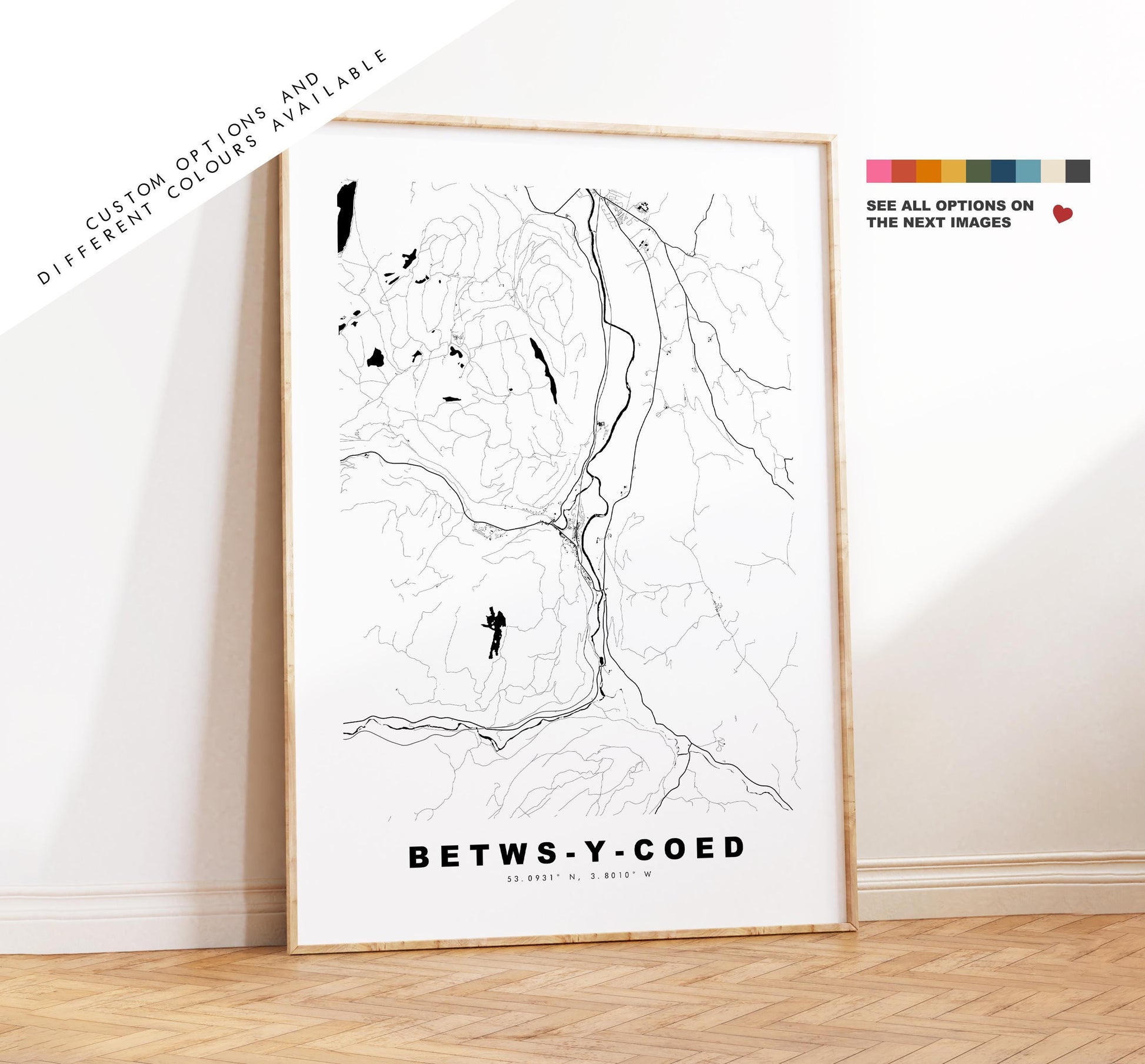 Betws-y-Coed map in a minimalist black/white style or choose from a range of colours. These maps look great as a feature piece or as part of a set over a statement piece of furniture. You can personalise this print by adding up to two lines of custom text beneath the city title, or by adding a heart over a location or address.