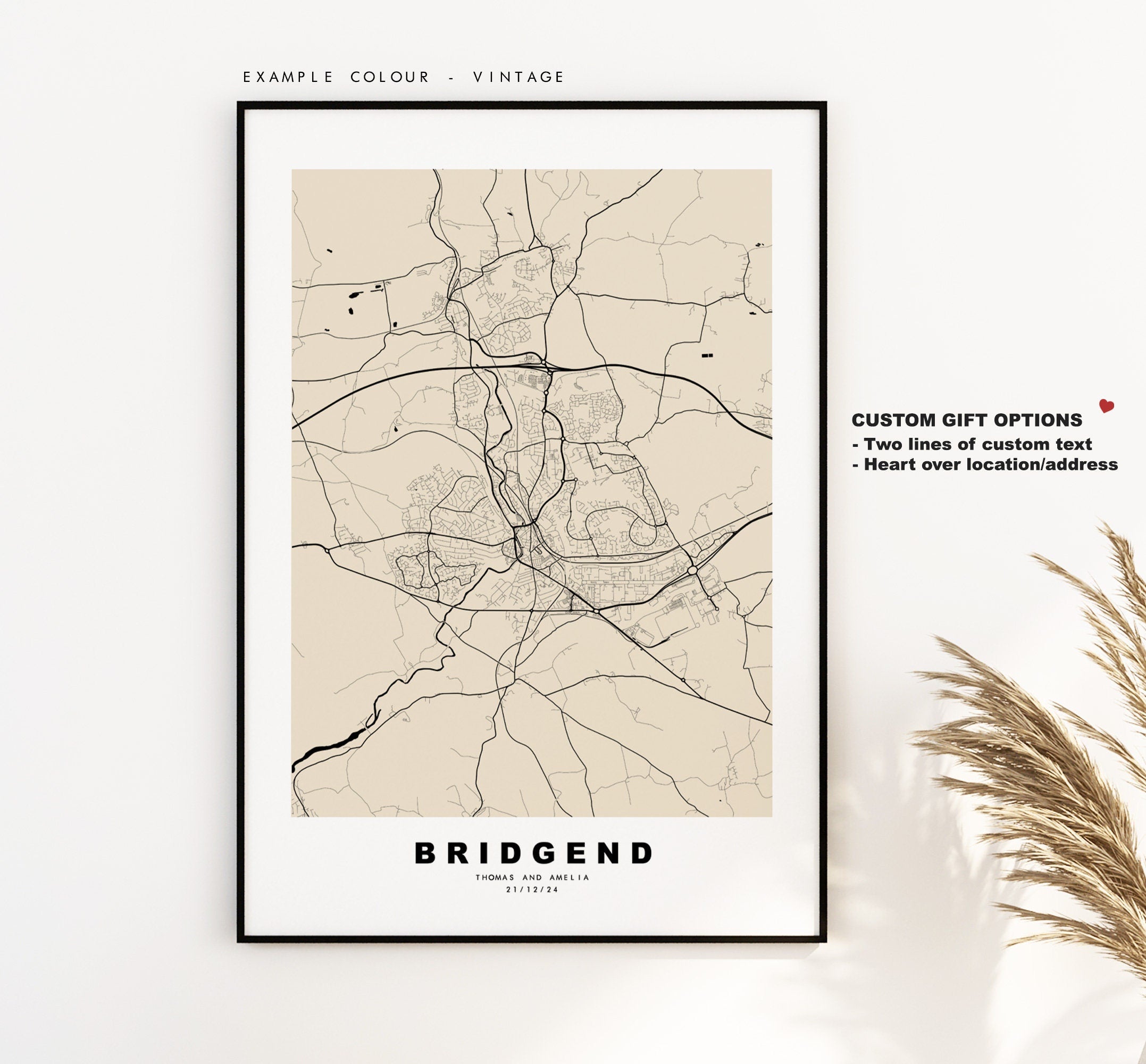 Bridgend map in a minimalist black/white style or choose from a range of colours. These maps look great as a feature piece or as part of a set over a statement piece of furniture. You can personalise this print by adding up to two lines of custom text beneath the city title, or by adding a heart over a location or address.