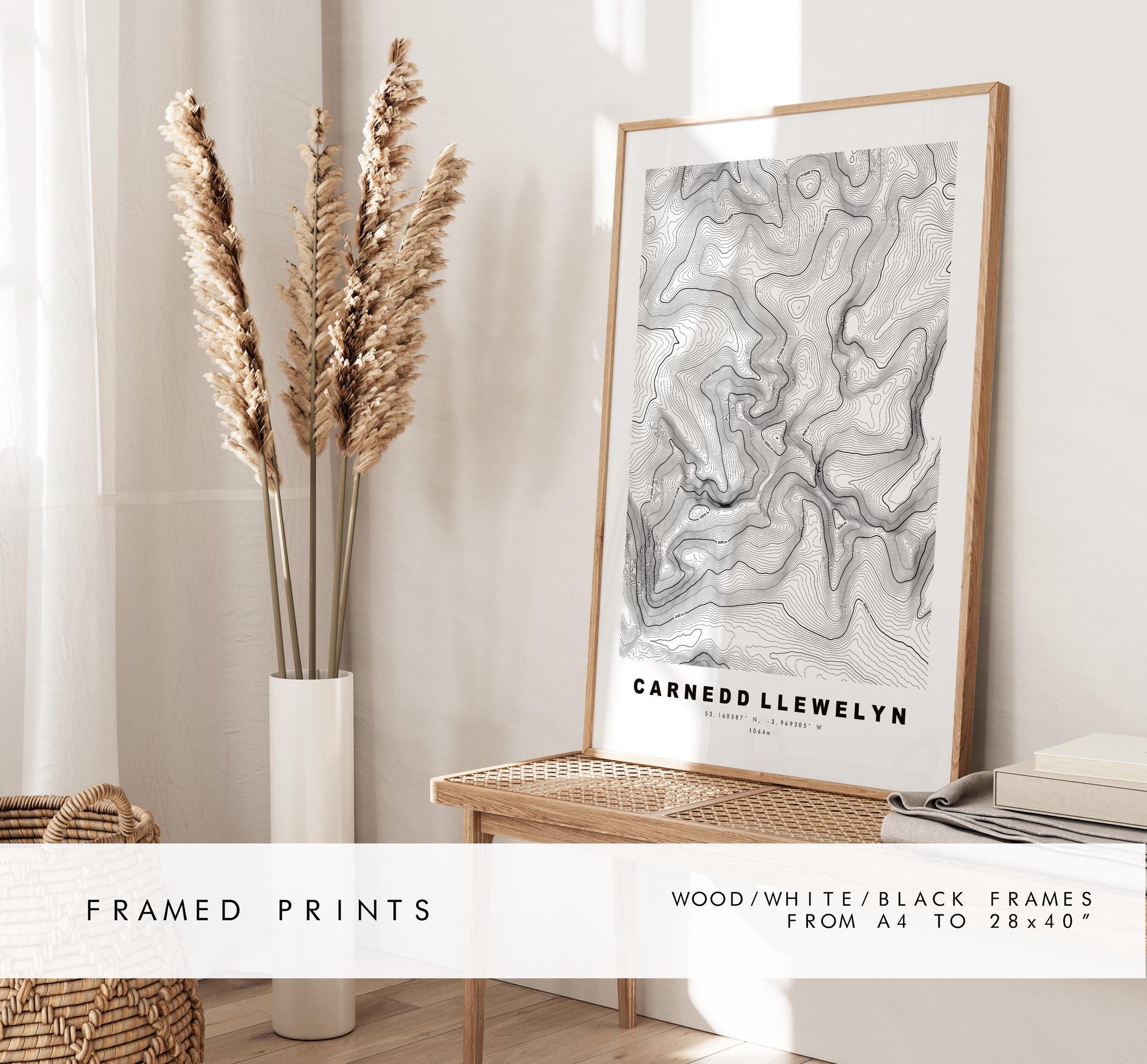 Carnedd Llewelyn contour map in a minimalist style, available in classic white/black or in a choice of map colours (see listing images). These contour maps are very detailed, with height markers at 200m intervals and the summit marked where possible - so the larger size the better!