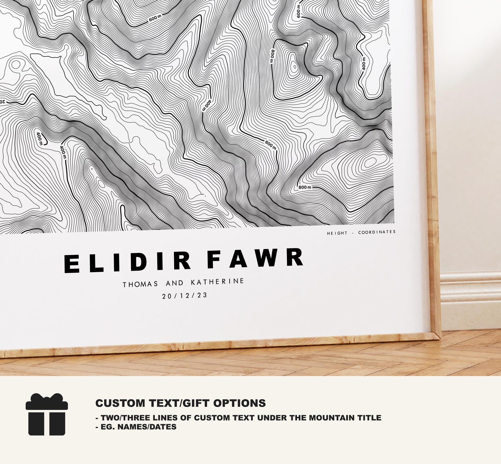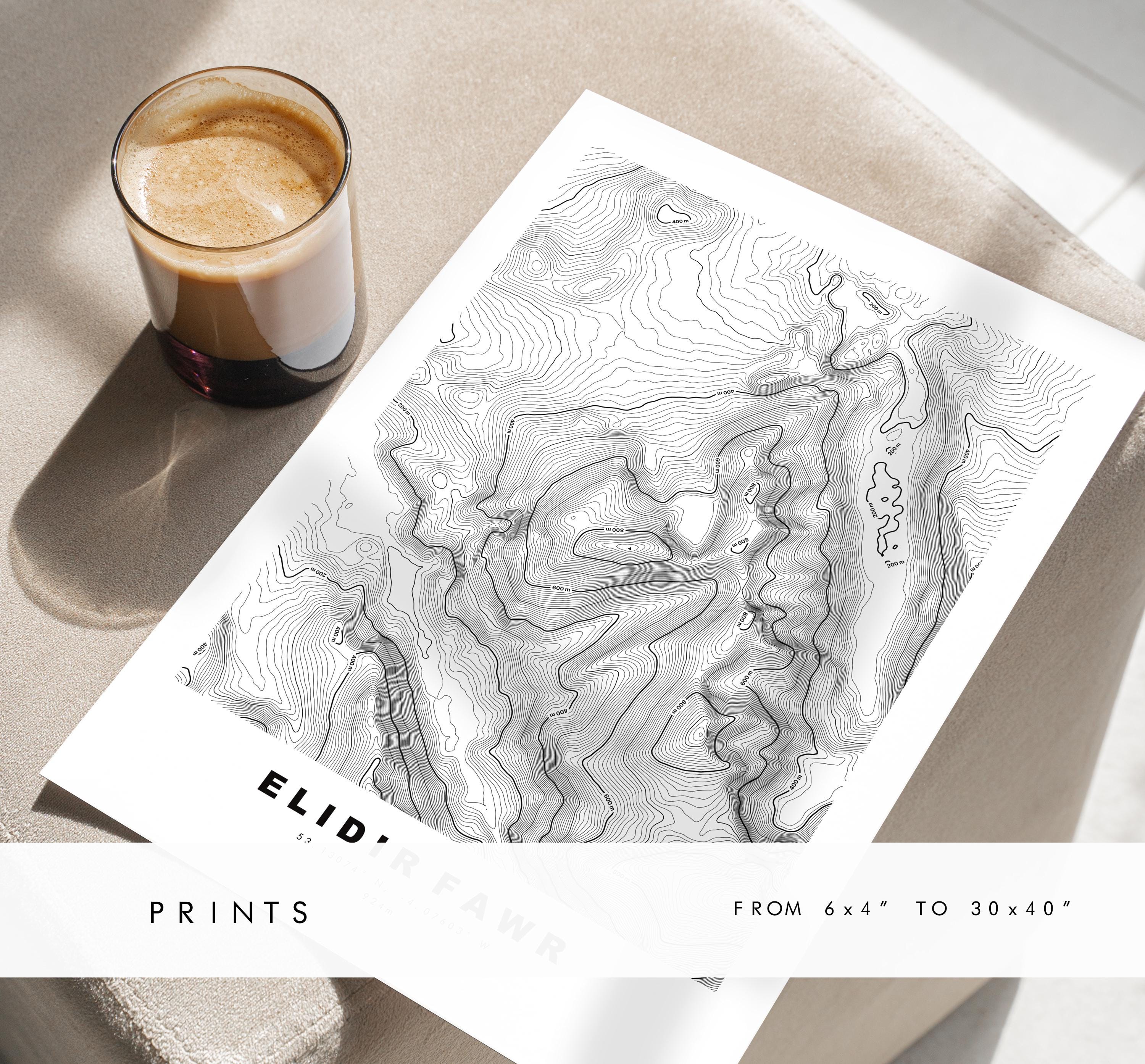 Elidir Fawr contour map in a minimalist style, available in classic white/black or in a choice of map colours (see listing images). These contour maps are very detailed, with height markers at 200m intervals and the summit marked where possible - so the larger size the better!