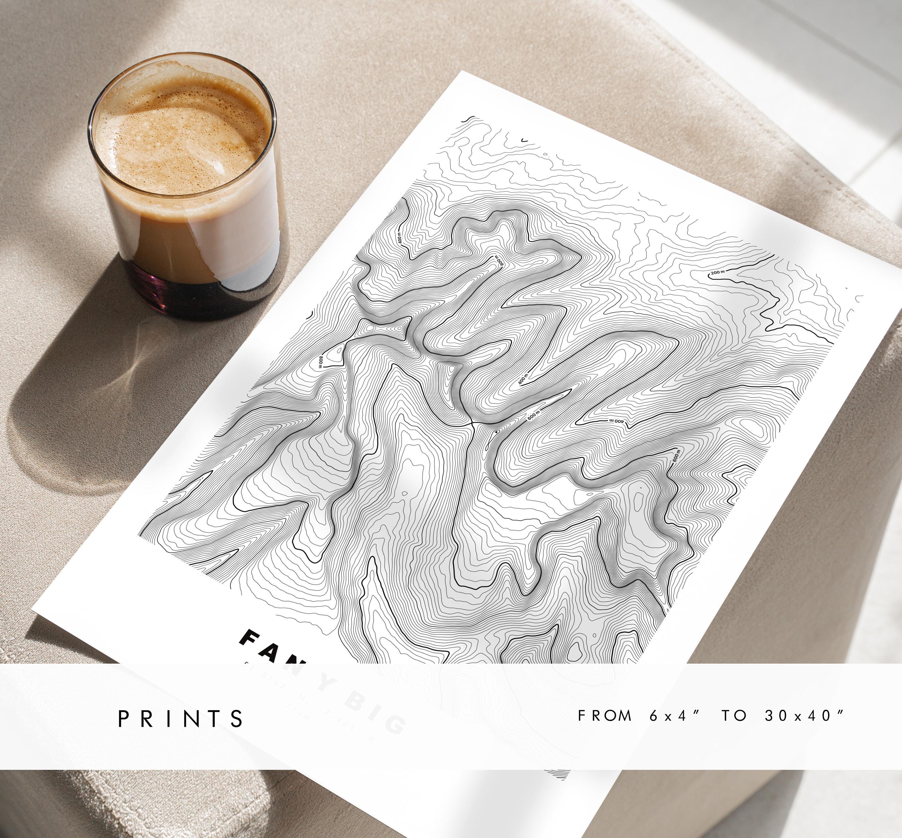 Fan y Big contour map in a minimalist style, available in classic white/black or in a choice of map colours (see listing images). These contour maps are very detailed, with height markers at 200m intervals and the summit marked where possible - so the larger size the better!
