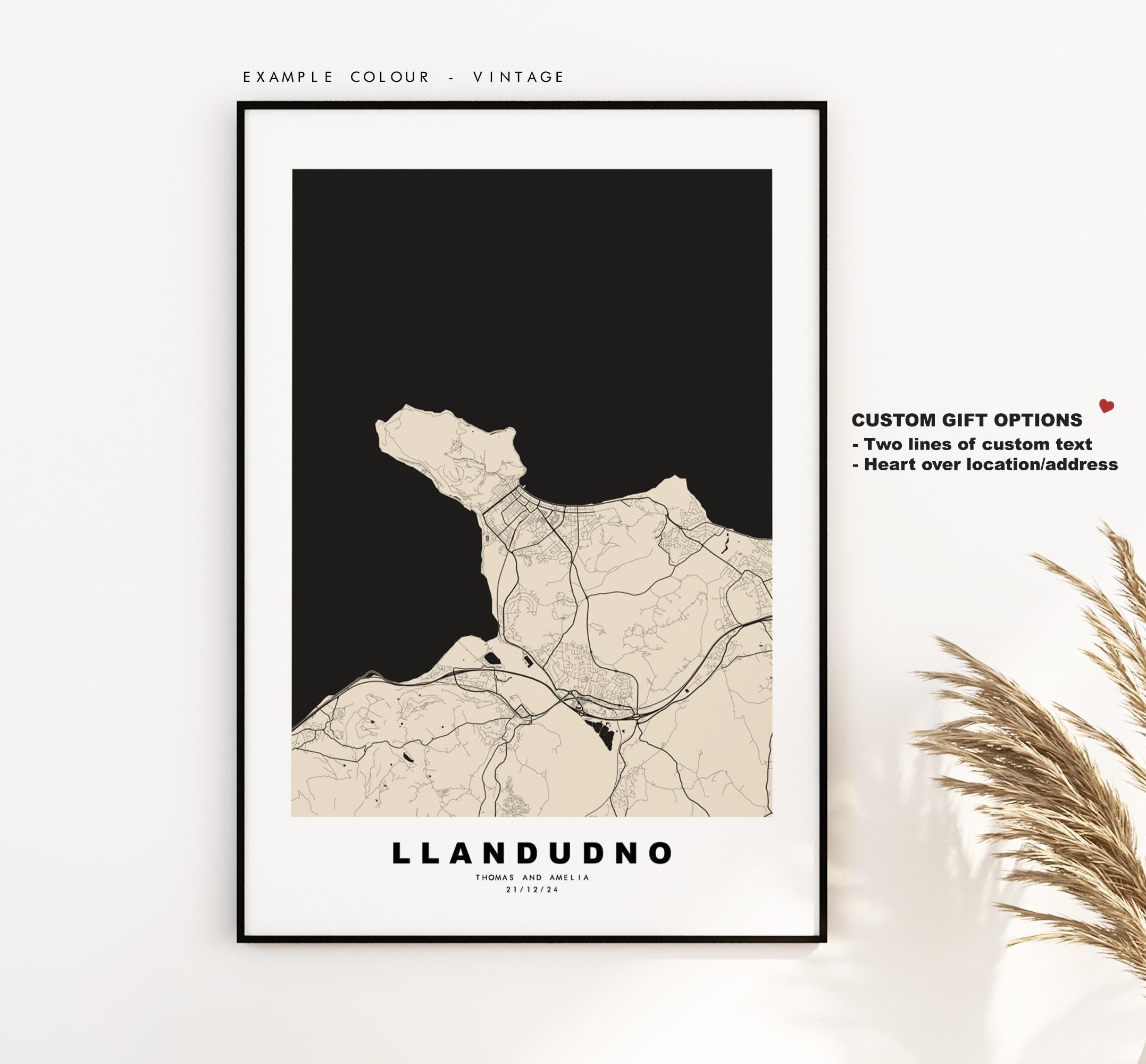Llandudno map in a minimalist black/white style or choose from a range of colours. These maps look great as a feature piece or as part of a set over a statement piece of furniture. You can personalise this print by adding up to two lines of custom text beneath the city title, or by adding a heart over a location or address.